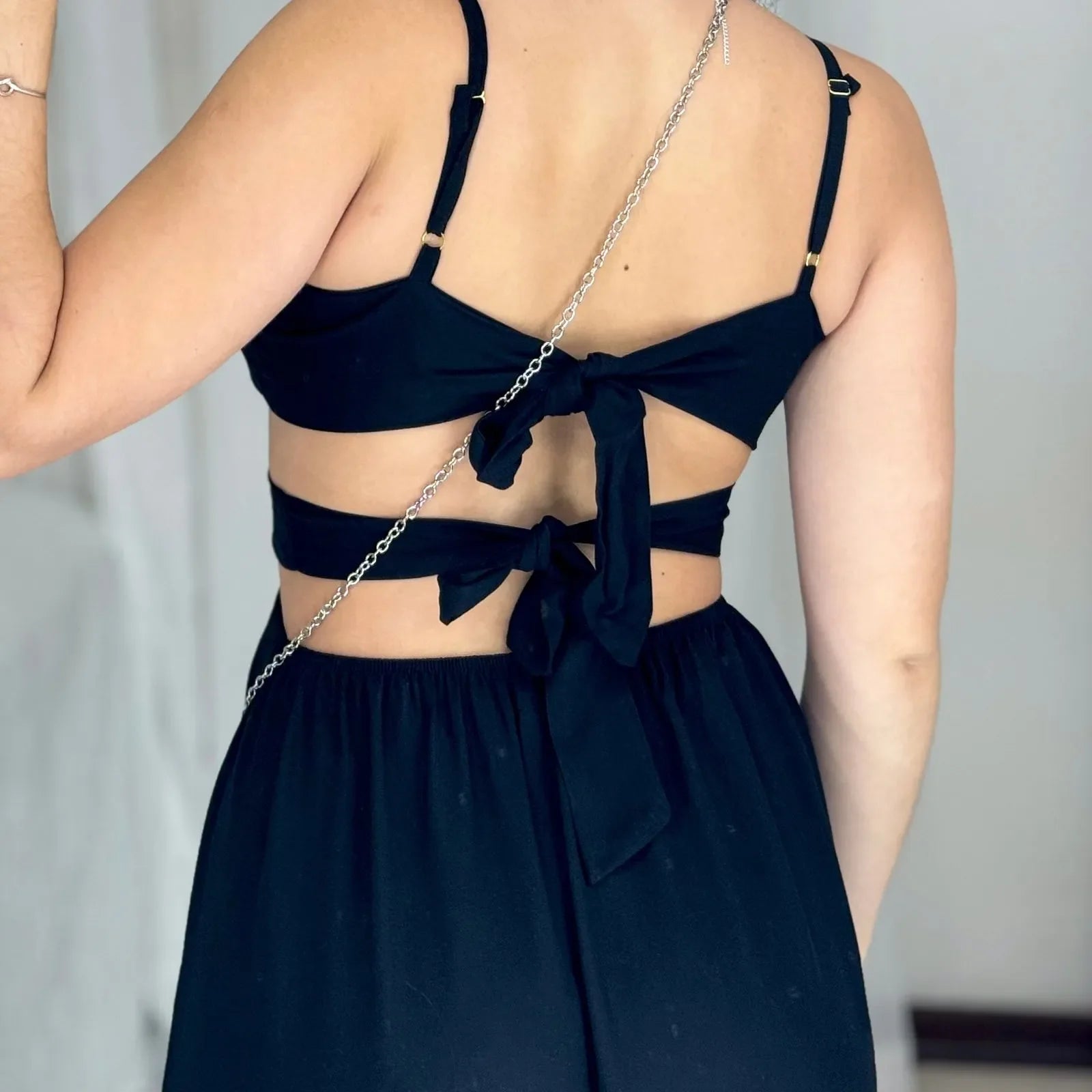Possui elástico na parte de trás da cintura, amarração nas costas e regulagem nas alças